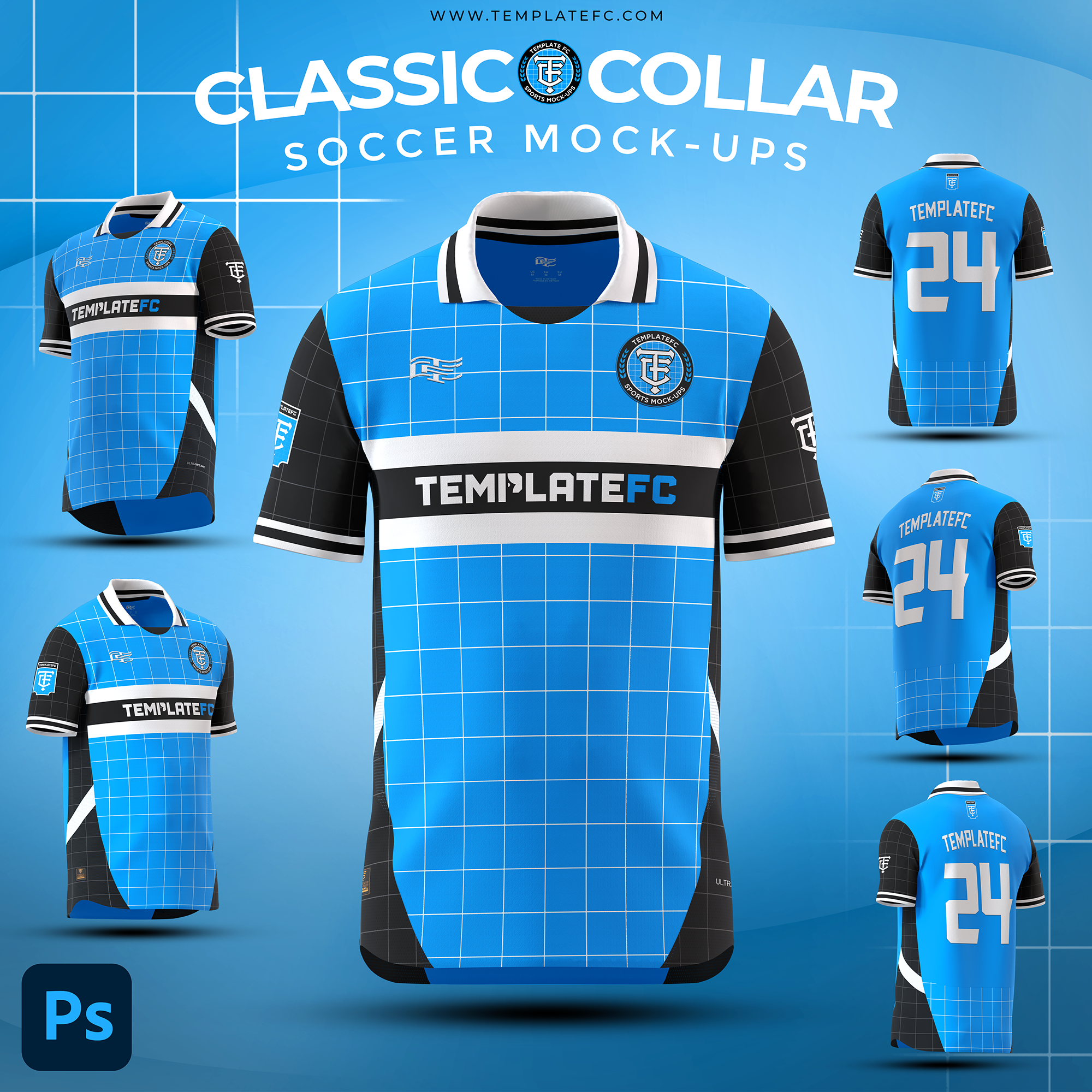 The Classic Collar Mock-Up Templates are high-quality, 5000 x 5500 px templates designed specifically for Photoshop. These mockup templates are perfect for showcasing your kit designs in the highest resolution possible. Additionally, they offer complete customization, allowing you to tailor every detail to your needs.
