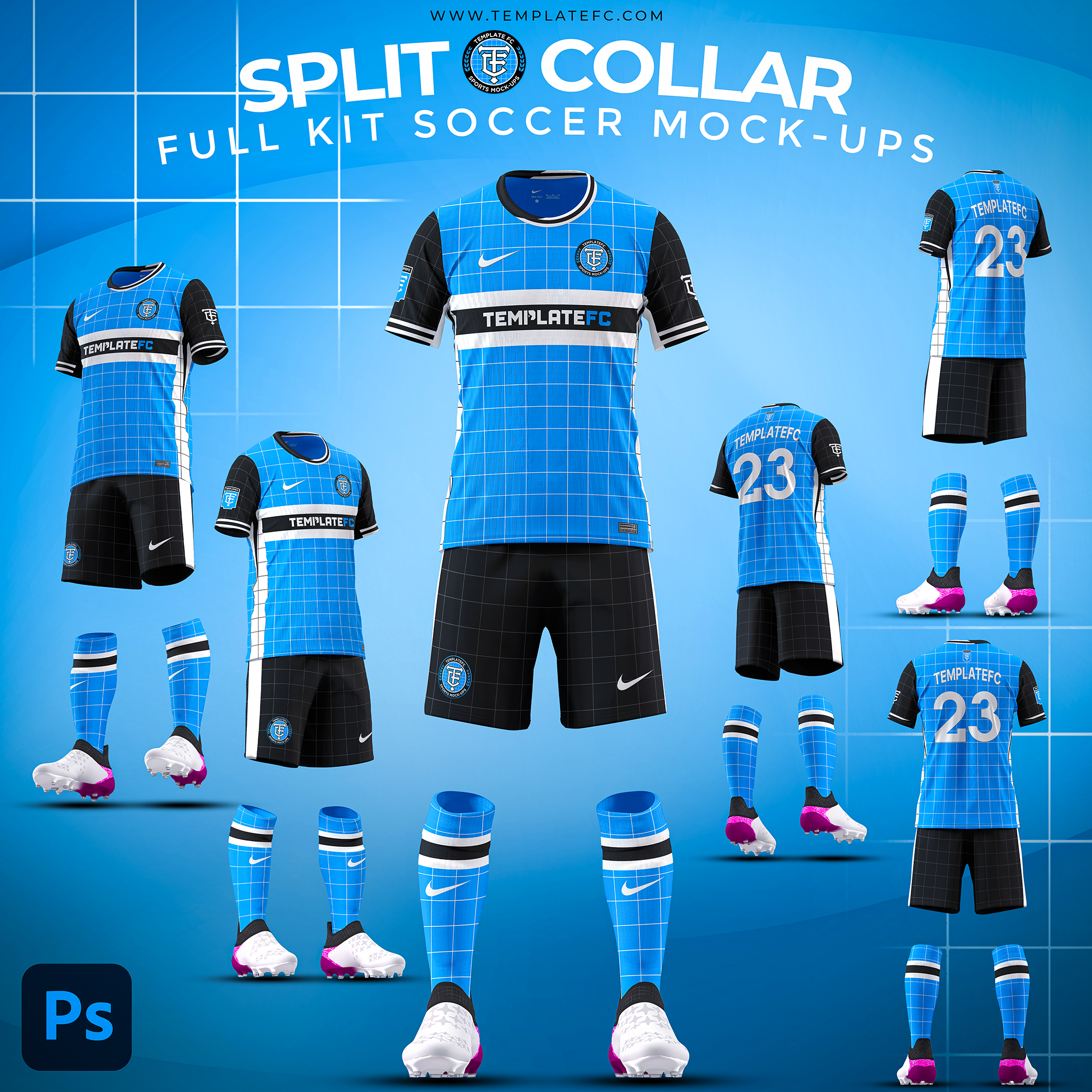 The Split Collar Full Kit Mock-Up Templates are 4000 x 8000 px soccer jersey templates created for Photoshop. These mockup templates are great for showing off your designs in the highest quality and allow for complete customization.
