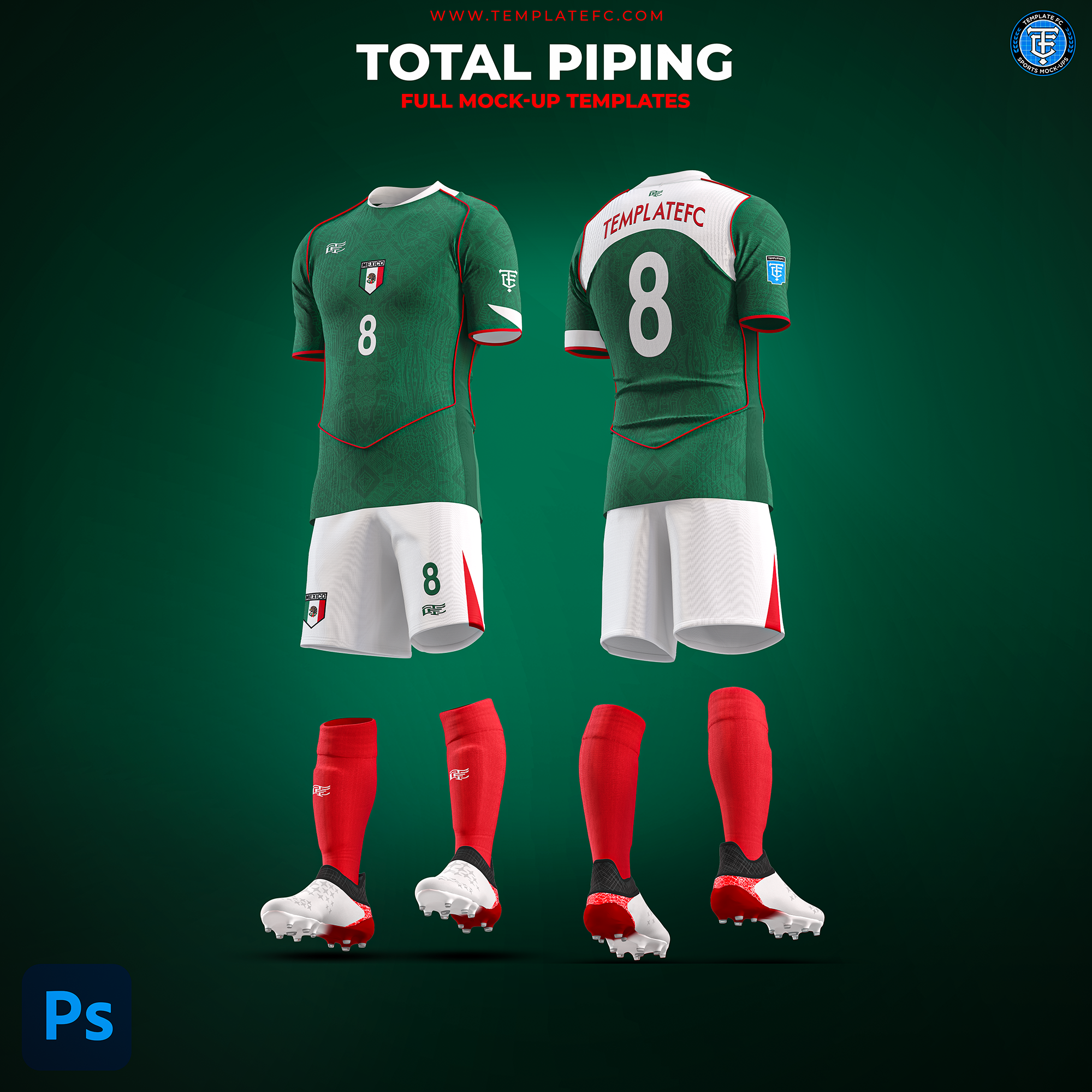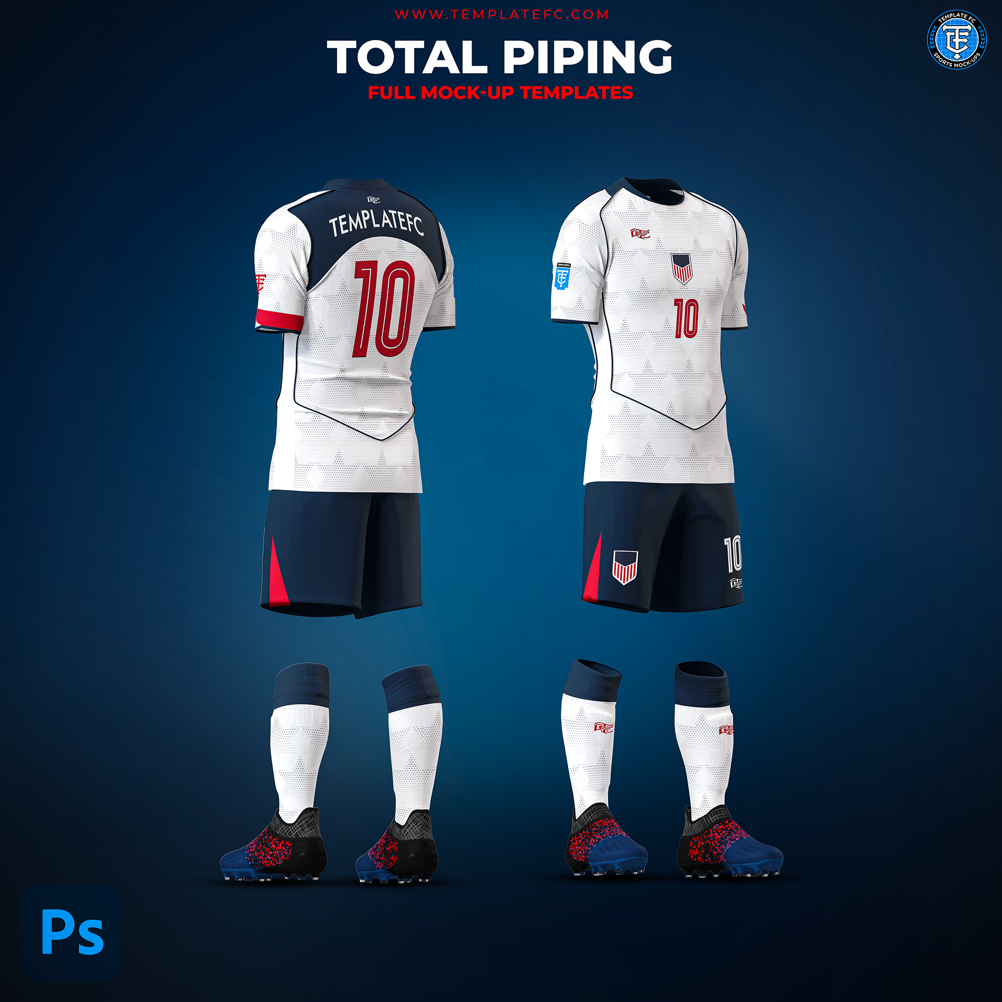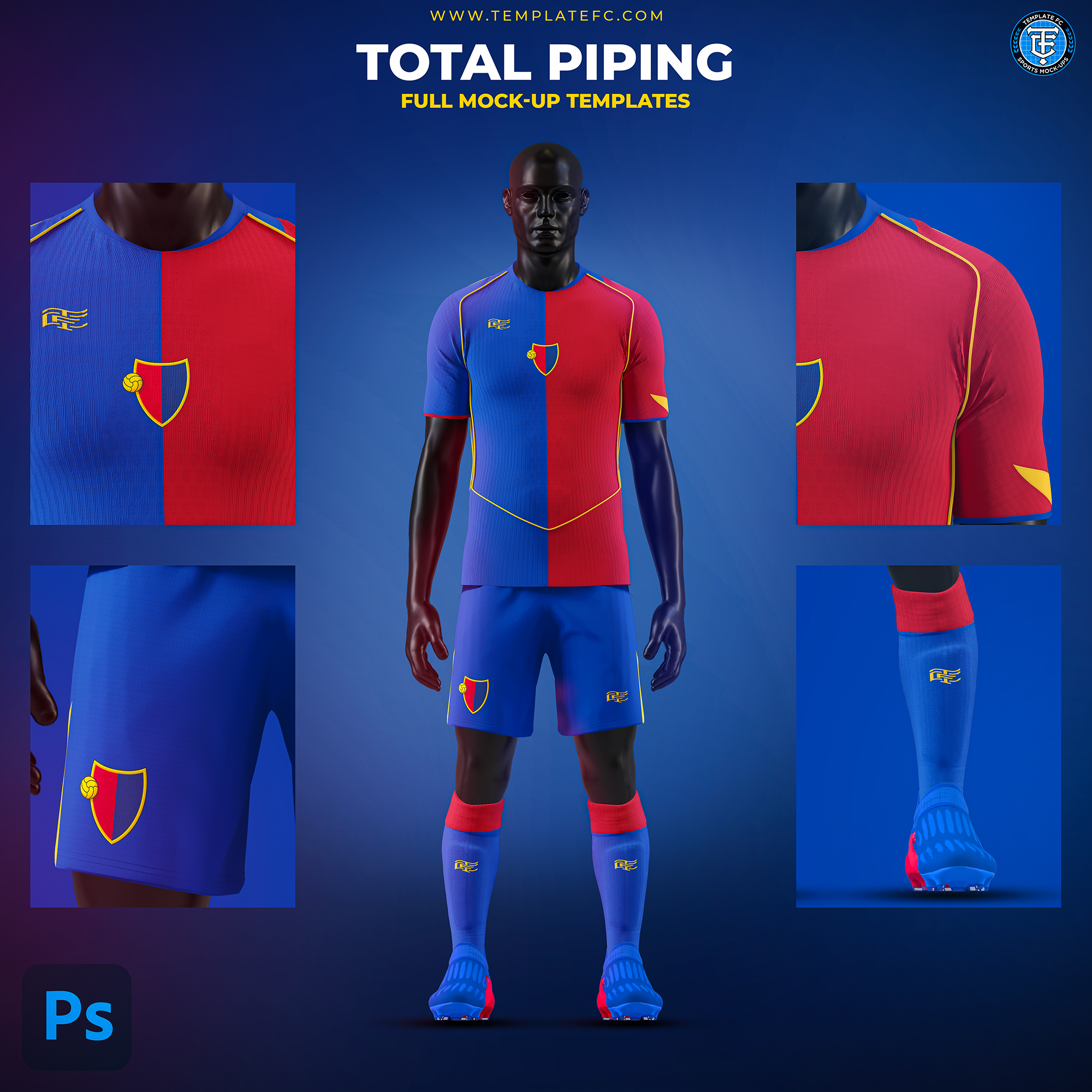 The Total Piping Full Kit Mock-Up Templates are high-quality, 4000 x 8000 px templates designed specifically for Photoshop. These mockup templates are perfect for showcasing your kit designs in the highest resolution possible. Additionally, they offer complete customization, allowing you to tailor every detail to your needs.